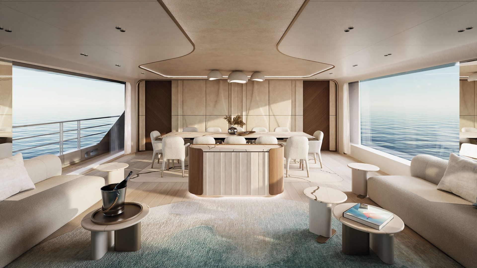At the heart of the yacht, there are larger-than-average interiors obtained thanks to an original architectural choice developing on two decks: one walkway only, on the port side, on the Main Deck; and one walkway only, on the starboard side, on the Upper Deck. This is not merely a design exercise, but a cutting-edge technical solution capable of combining wide volumes, elegance, and a sporty character.